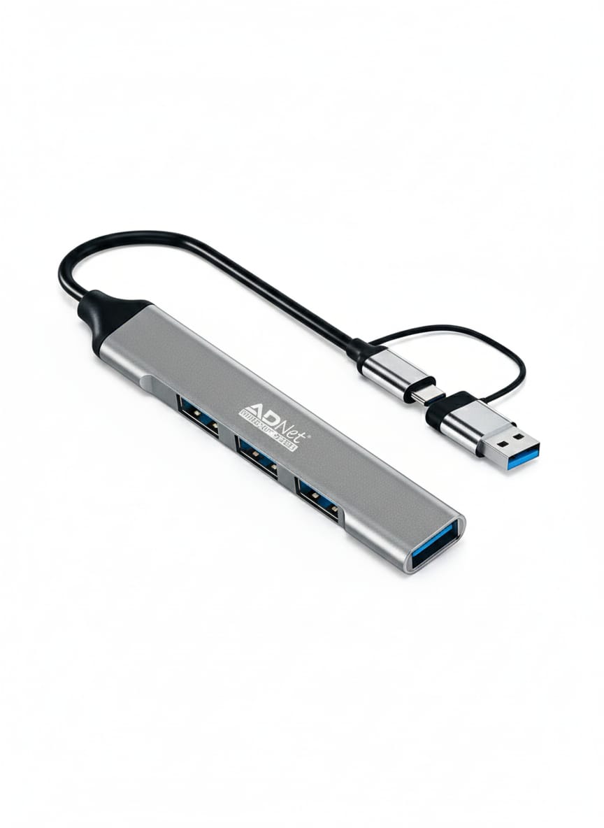 Expand your workspace with the ADNet AD-CH-228, a premium alloy-body 4-port USB hub. Featuring a versatile Type-C and USB 3.0 combo plug, it delivers blazing-fast 5 Gbps speeds for laptops, PCs, and tablets. This plug-and-play hub is the ultimate tool for connecting multiple peripherals like hard drives, mice, and keyboards simultaneously.